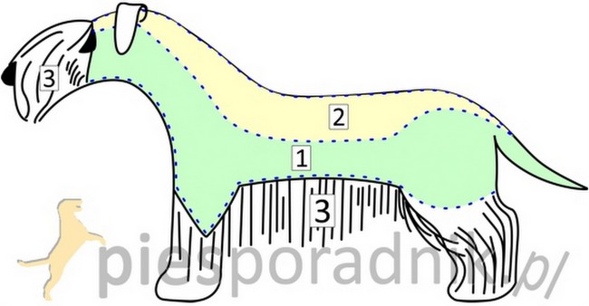 Maszynką z nasadką 5 mm strzyżemy z włosem boki tułowia począwszy od końca łopatki do przedniej krawędzi uda. To jest odcinek zawarty miedzy liniami przerywanymi. Włos teriera czeskiego musi spływać po bokach ciała, w żadnym wypadku nie może go poszerzać po bokach.