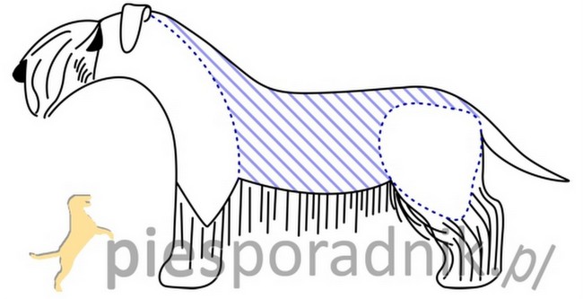 Maszynką z nasadką 5 mm strzyżemy z włosem boki tułowia począwszy od końca łopatki do przedniej krawędzi uda. To jest odcinek zawarty miedzy liniami przerywanymi. Włos teriera czeskiego musi spływać po bokach ciała, w żadnym wypadku nie może go poszerzać po bokach.
