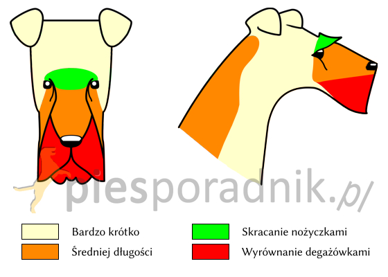 Szyja z przedniej strony powinna być wytrymowana bardzo krótko, na całym, dobrze widocznym na rysunku obszarze w kształcie łezki, wyznaczonym przez linie biegnące od zewnętrznej nasady uszu do rękojeści mostka. Poniżej tej linii całe przedpiersie, w dół aż do nóg, a na boki aż do łopatek również powinno być krótko wytrymowane, ale nieco dłużej niż na szyi. Tylna część szyi musi być trymowana razem z całą linią górną bo jest jej elementem.