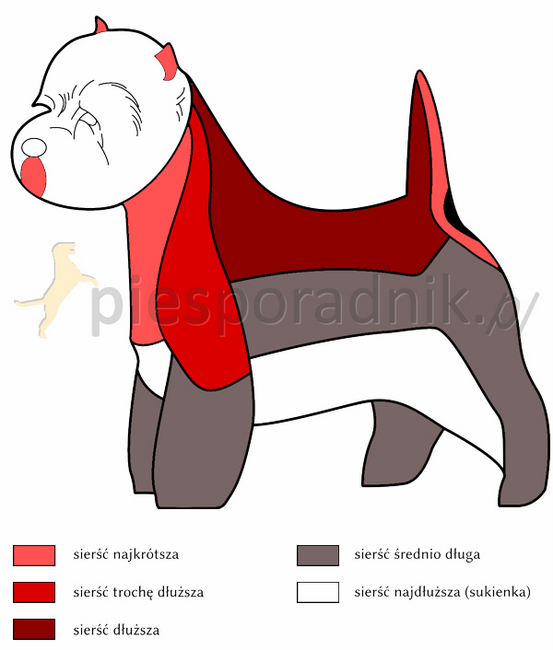 • Ogon trymujemy bardzo krótko, szczególnie z tylnej strony, gdzie w razie potrzeby można go wyrównać degażówkami. Powinien być w kształcie marchewki, u nasady grubszy i wyraźnie zwężający się w kierunku czubka, który nie może być łysy, ani tym bardziej kończyć się pędzlem włosów. Tylna strona ud, czyli pośladki, muszą być bardzo krótko wytrymowane lub wziąwszy pod uwagę fakt, że jest to miejsce bardzo wrażliwe – wyrównane nożyczkami degażującymi. Bardzo mocno skracamy sierść w okolicy odbytu, jest to niezbędne do utrzymania higieny, w przeciwnym razie pies będzie się w tym miejscu stale brudził.