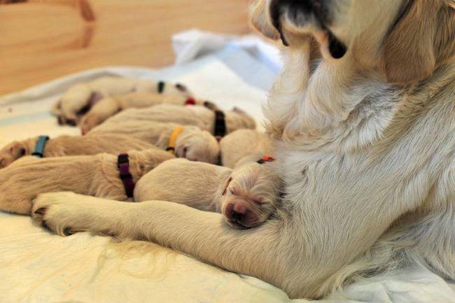 Bardzo ważne jest oznaczenie szczeniąt kolorowymi wstążeczkami i regularne ich ważenie: w pierwszym tygodniu codziennie, w drugim raz na dwa dni, później już tylko raz na tydzień, na przykład w każdą sobotę.