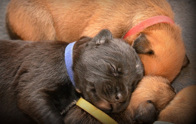 Szczenięta rodzą się ślepe i głuche, przez pierwsze dwa tygodnie nie jesteśmy w stanie nawiązać z nimi kontaktu. Jedyny zmysł, z jakiego maluchy na tym etapie życia robią użytek to węch, który niezawodnie prowadzi je do pełnych, pachnących mlekiem sutków. Instynktowna potrzeba ciepła każe im wtulać się w matkę. Jeśli jej nie ma, bo jest na spacerze, zbijają się w kupkę, bo tak jest im cieplej. Jeśli nad kojcem włączymy lampę na podczerwień, cała gromadka z pewnością ulokuje się bezpośrednio pod nią. Szczenięta śpią jeden na drugim tuląc się do siebie, ponieważ w ten sposób wzajemnie się ogrzewają. Przytulanie zwiększa także ich poczucie bezpieczeństwa w myśl zasady samemu – zimno i źle, razem ciepło i bezpiecznie. Takie zachowania będą bazą do nauki współżycia z innymi psami i przywiązania psa do swojego pana, przy którym czuje się dobrze i bezpiecznie.