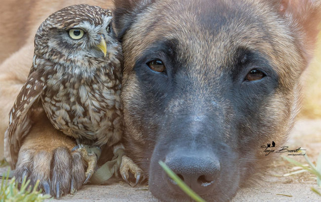 Wprawdzie większość psów nie wykazuje złych zamiarów wobec ptaków, ale od tolerancji do przyjaźni droga zazwyczaj bywa daleka. Jednak nie w przypadku tej wyjątkowej pary: owczarka belgijskiego o imieniu Ingo i sówki Poldi, która bez swojego czworonożnego towarzysza już nie wyobraża sobie życia. Są nierozłączni, on ją chroni, daje poczycie bezpieczeństwa, ogrzewa a jeśli trzeba, służy za środek transportu. Ona przytula się do niego i obdarza go bezgranicznym zaufaniem. Poldi jest niewielkim ptakiem z rodziny puszczykowatych, które zamieszkują praktycznie całą Europę z wyjątkiem Skandynawii i prowadzą osiadły tryb życia. Najchętniej znajdują sobie miejsce w pobliżu ludzkich osiedli, uwielbiają stare zabudowania, dziuplaste wierzby, liściaste aleje oraz parki. Jest ich bardzo niewiele, są praktycznie na wyginięciu i dlatego są pod ochroną. Kiedyś zamieszkiwały głównie tereny wiejskie, teraz osiedlają się coraz bliżej miast. Nic więc dziwnego, że jednego z nich dość szybko udało się oswoić i udomowić a na dodatek zaprzyjaźnić z psem.