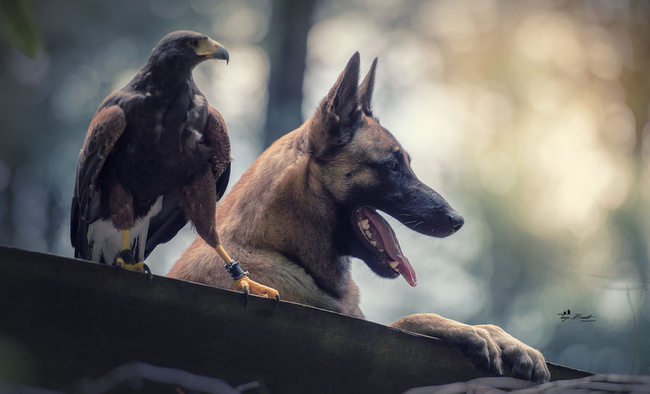 Nikt by się pewnie o tej parze nie dowiedział gdyby nie to, że ich właścicielką jest Tanja Brandt, znana niemiecka fotografka, która specjalizuje się w fotografowaniu zwierząt. Pójdźka zwyczajna, bo tak po polsku nazywa się rasa do której należy bohaterka tego opowiadania, jest ptakiem niewielkim, jej wzrost rzadko przekracza 26 cm. Poldi na skutek defektu genetycznego była jeszcze mniejsza, tak mała, że gdyby nie otrzymała pomocy, nie byłaby w stanie samodzielnie radzić sobie w naturze. Miała szczęście, znalazła ją Tanja Brandt i natychmiast wzięła pod swoją opiekę. Zabierała ją ze sobą na spacery, które oczywiście wykorzystywała do robienia zdjęć. Z czasem zaczął im towarzyszyć jej pies Ingo, który pójdźkę natychmiast zaakceptował i tak jakby wiedział, że tego potrzebuje, zaczął się nią opiekować. Gdyby nie obawa przed posądzeniem o antropomorfizm, można by powiedzieć, że widocznie wydedukował, że skoro przyjaciele jego pani są jego przyjaciółmi, on również powinien sówkę polubić i stać się jej opiekunem. Widocznie polubił ptaki, bo jakby tego było mało, zaprzyjaźnił sie również z orłem. Popatrzcie na zdjęcia, one najlepiej to pokazują.