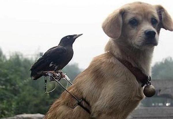 Ingo i Poldi nie są wyjątkiem. Widoczny na tym zdjęciu kruk najpierw spędzał niemal cały dzień w klatce i tylko pod nieobecność psa był z niej wypuszczany. Potem, kiedy okazało się, że pies przejawia przyjazne zainteresowanie ptakiem, właściciele postanowili otworzyć klatkę, kiedy pies był w pokoju. Kruk natychmiast z tego skorzystał i bez najmniejszej obawy wyszedł na zewnątrz. Po kilku dniach usiadł psu na grzbiecie i od tej pory było to jego ulubione miejsce. Pies znosił to ze stoickim spokojem choć zdarzało się że ptak zadrapał go pazurami. Troskliwi opiekunowie skonstruowali więc specjalną uprząż z drewnianą poprzeczką, przypominającą tę, jaką montuje się w klatce.