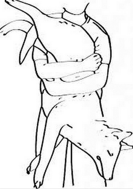 Często dobry efekt można osiągnąć stosując sztuczne oddychanie usta – nos. W tym celu odchylamy głowę psa do tyłu, wyciągamy język uważając, żeby go nie przyciąć zębami i oburącz obejmujemy fafle, tworząc coś na kształt rurki. Chodzi o to, żeby „uszczelnić” mu pysk w taki sposób, żeby wdmuchiwane powietrze dostawało się do nosa, a nie wychodziło na zewnątrz. Pies powinien być przy tym tak ułożony, żeby głowa tworzyła jedną linię z tułowiem. Długimi, równymi dmuchnięciami wprowadzamy mu powietrze do nosa a sami wdychamy powietrze przez nos.