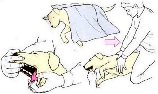 Kładziemy psa na boku i wyciągamy mu język w bok, w kierunku ziemi, żeby ułatwić mu oddychanie. Jeśli w pysku znajdują się jakieś wodorosty, dokładnie je usuwamy, bo mogą spowodować zaksztuszenie. W przypadku, gdy pies nie oddycha, kładziemy go na prawym boku i rozpoczynamy masaż serca. Polega on na dość mocnym, rytmicznym uciskaniu płasko ułożoną dłonią okolicy serca tak długo, aż pojawi się oddech. Nie wolno z uciskiem przesadzać, żeby nie połamać mu żeber.