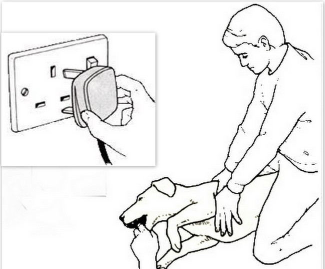 Jeśli zobaczymy, że pies leży nieprzytomny w pobliżu źródła prądu, w pierwszym rzędzie należy wyciągnąć kabel z kontaktu a dopiero potem przystąpić do udzielania pierwszej pomocy. Jeśli dostęp do gniazdka jest utrudniony można posłużyć się jakimś drewnianym przedmiotem, np. kijem od szczotki. Nie wolno dotykać psa przed odłączeniem źródła prądu, bo grozi to porażeniem ratującego.