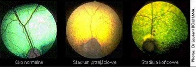 Tak wygląda obraz dna oka u psa cierpiącego na postępujący zanik siatkówki. Począwszy od lewej strony widać obraz prawidłowy, następnie stadium pośrednie schorzenia a po prawej stronie dno oka w ostatniej fazie choroby, kiedy pies już praktycznie nie widzi. Jest to jak widać choroba o wyjątkowo ciężkim przebiegu, którego nie da się niestety zatrzymać. Na pytanie czy da się jej zapobiec odpowiedź jest niestety negatywna.