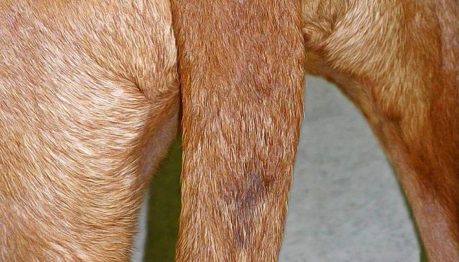 Pierwszym widocznym sygnałem, że z tarczką ogonową dzieje się coś niedobrego, jest pojawienie się na grzbietowej stronie ogona, w niewielkiej odległości od jego nasady, owalnego, wyraźnie odgraniczonego, stale powiększającego się obszaru z coraz bardziej przerzedzoną sierścią, a potem zupełnie łysego. Zmieniona chorobowo skóra ma w tym miejscu tendencję do łuszczenia się, staje się tłusta i pokryta łojem, może pojawić się również obrzęk, zaczerwienienie i wypryski. Bywa, że na skutek powikłania w postaci infekcji bakteryjnych lub grzybiczych, a czasem obydwu naraz, powstają rany z których sączy się ropa lub krew. Przeważnie towarzyszy temu zmatowienie i przesuszenie sierści na całym ciele, suchy łupież oraz depigmentacja włosa. U psów, u których stwierdzono znaczne podwyższenie poziomu męskich hormonów we krwi, często dochodzi do przerostu gruczołu ogonowego i powstania w nim tworów o charakterze gruczolaków, a niekiedy również do jednoczesnych zmian przerostowych gruczołów okołoodbytowych oraz gruczołu krokowego