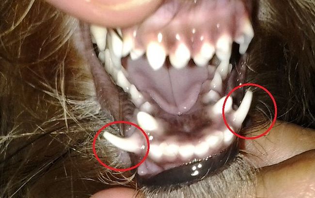 Na pierwszym planie widać stały kieł a z jego lewej strony kieł mleczny. Jest to tzw. przetrwały ząb mleczny a obecność tego rodzaju zębów stwierdza się u około 15% populacji psów. Dotyczy to najczęściej kłów, choć może się zdarzyć, że pies ma kilka a w skrajnych przypadkach nawet kilkanaście przetrwałych mleczaków. Takie anomalie występują przeważnie u psów małych ras, takich jak np. yorkshire terier, maltańczyk, pinczer miniaturowy, chihuahua, jamnik miniaturowy i króliczy. U psów dużych ras problem ten pojawia się raczej rzadko, przeważnie u labradorów, wyżłów i owczarków niemieckich.