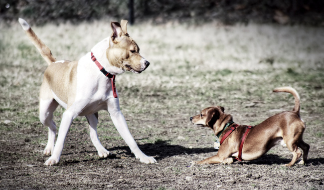 Niezwykle rzadko spotkanie dwóch psów podobnej wielkości jest groźne. Siłowanie się ma na celu potwierdzenie dominującej pozycji jednego z psów. Aspekt wizualny przypomina przedstawienie teatralne. Pies, który próbuje zdominować drugiego unosi fafle, głośno warczy, stroszy sierść, ma wyprostowane łapy i nieruchomy ogon. Taka postawa ma na celu pokazanie siły i zmuszenie do uległości a nie zranienie przeciwnika. Przeważnie kończy się na warczeniu i w momencie, gdy jeden z nich podda się kładąc się na plecy “bitwa” się kończy.