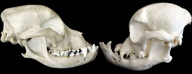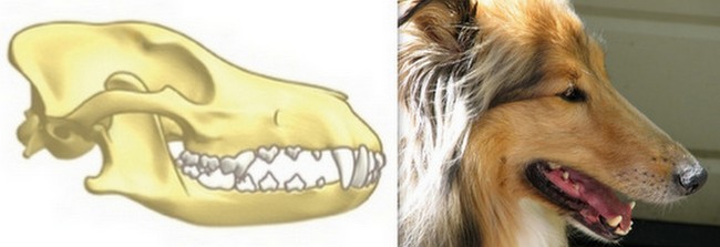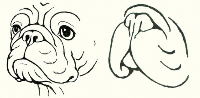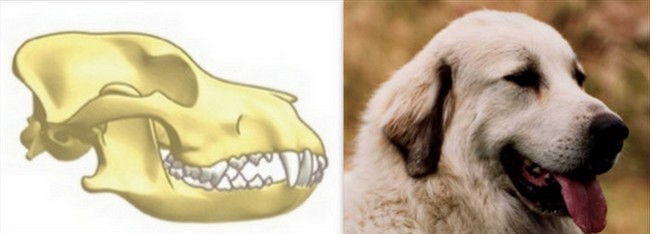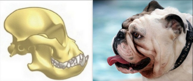 Czaszka psa składa się z dwóch części: mózgoczaszki oraz trzewioczaszki, której główną częścią jest kufa, zakończona truflą nosową z wyraźnie widocznymi, otwartymi nozdrzami. Obie te części oddzielone są od siebie przełomem czołowo-nosowym, tzw. stopem. Istotne znaczenie ma długość kufy, bo to od niej zależy indeks cefaliczny głowy a co za tym idzie, zgryz psa. Przy długiej i średniej długości kufie pies ma zazwyczaj regularny zgryz nożycowy, który w miarę jej skracania przechodzi najpierw w nieduży, a potem coraz większy przodozgryz. W przypadku prawidłowej budowy czaszki, przy zamkniętym pysku zęby nie powinny być widoczne. Widać to bardzo wyraźnie na poniższym zdjęciu obrazującym, w jaki sposób na przestrzeni lat zmieniła się czaszka buldoga angielskiego. Nietrudno sobie wyobrazić jak niekorzystnie ta zmiana wpłynęła na jego zdrowie i komfort życia.