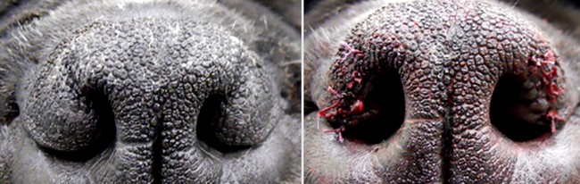 Nozdrza psa przed i po wykonaniu korekty skrzydełek nosowych