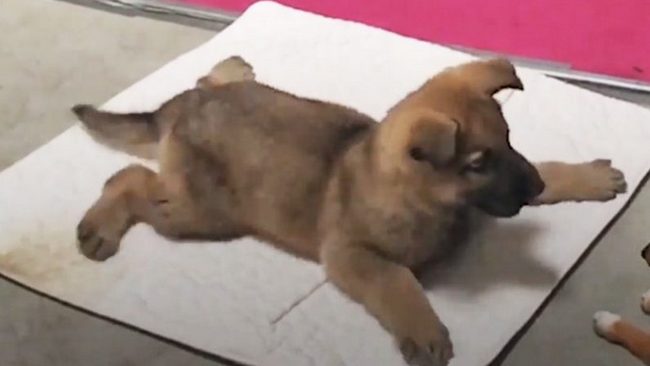 - zwiotczenie ciała, w przeciwieństwie do rodzeństwa szczenię cały czas leży na brzuchu