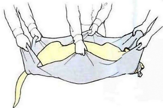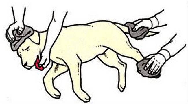 • Jeśli mamy pewność, że lecznica jest gotowa na przyjęcie psa, układamy go na tylnym siedzeniu samochodu. Nigdy nie wolno umieścić go w nagrzanym samochodzie, temperatura w jego wnętrzu powinna najpierw zostać obniżona przez włączenie silnika i klimatyzacji, po uprzednim zamknięciu wszystkich drzwi i okien. Kiedy pies już zostanie ułożony na tylnym siedzeniu, można w czasie dojazdu otworzyć wszystkie okna, żeby zapewnić odpowiednią cyrkulację powietrza pod warunkiem, że to obniży a nie podwyższy temperaturę w jego wnętrzu.