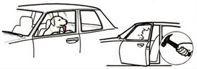 Zawsze trzeba zacząć od próby znalezienia właściciela, dopiero jeśli te usiłowania nie przyniosą skutku, mamy prawo podjąć bardziej drastyczne kroki zmierzające do uwolnienia psa. Jeżeli pies zamknięty w samochodzie ledwo oddycha, ma konwulsje, traci przytomność, mamy prawo wybić w samochodzie szybę, aby go ratować. W tej sytuacji życie zwierzęcia jest wyższą wartością niż szyba w samochodzie i taka interwencja jest w pełni uzasadniona.