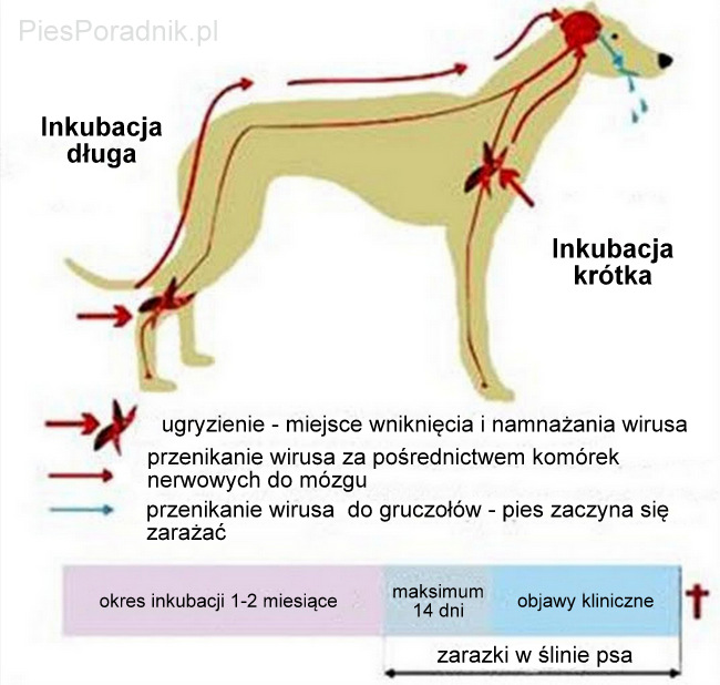 Na szkicu bardzo wyraźnie widać, że już 14 dni przed pojawieniem się objawów choroby pies zaczyna zarażać. To pokazuje jak bardzo wścieklizna jest niebezpieczna dla ludzi, zanim właściciel zorientuje się, że jego pies jest chory, sam może być już zarażony.