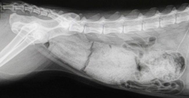 U psa cierpiącego na zaparcia, dolny odcinek jelita grubego wygląda jak na poniższym zdjęciu rtg – jest rozdęty i przepełniony zbitymi masami kałowymi, których pies nie potrafi się pozbyć. Widać to w miejscach oznaczonych czerwonymi strzałkami. W tym przypadku jest to zbity korek, który powstał na skutek podania psu sporej ilości zmielonych kości.