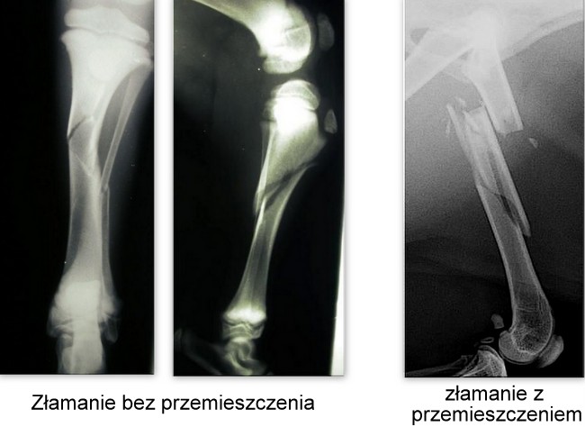 Złamanie zawsze oznacza przerwanie ciągłości kości. Jej fragmenty mogą pozostać na swoim miejscu, mamy wówczas do czynienia ze złamaniem najprostszym, bez przemieszczenia, które wymaga jedynie nałożenia opatrunku gipsowego na czas zrastania. Fragmenty kości mogą również ulec przemieszczeniu względem siebie, niekiedy tak znacznemu, że dochodzi do uszkodzenia tkanki mięśniowej i kość przebiwszy skórę wychodzi na zewnątrz. Jest to najbardziej skomplikowana forma złamania, które wymaga operacyjnego ustawienia fragmentów kości. W niektórych przypadkach niezbędne jest wzmocnienie złożonych kości przy pomocy odpowiednich blaszek lub śrub, żeby zapobiec ich przemieszczaniu. Złamaną kość trzeba najpierw ustawić w prawidłowej pozycji a następnie tak unieruchomić i zabezpieczyć przed przemieszczeniem, żeby się prawidłowo zrosła. Szansa na prawidłowe zrośniecie kości zależy od rodzaju złamania, jego lokalizacji, wieku psa, jego stanu ogólnego i odpowiedniej rehabilitacji. Również ze strony właściciela potrzebna jest odpowiednia opieka, żeby nie dopuścić do zainfekowania rany i dopilnować psa, żeby sam sobie nie zrobił krzywdy.