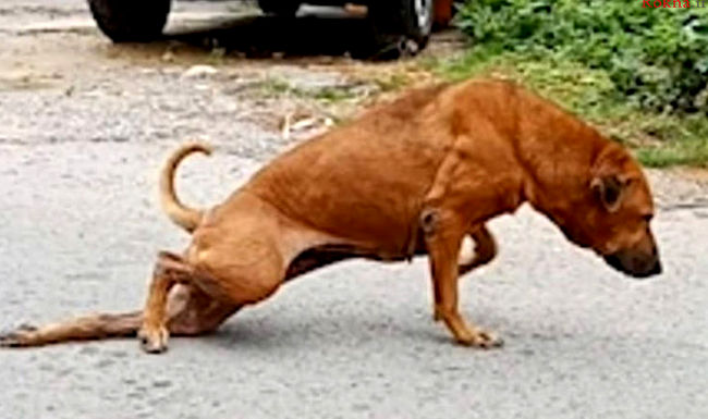 • Przy złamaniu kręgosłupa w odcinku dolnym lub środkowym – pies nie może poruszać tylnymi kończynami, wystepuje brak czucia w opuszkach palców tylnych kończyn, szczypanie nie powoduje ich cofania.